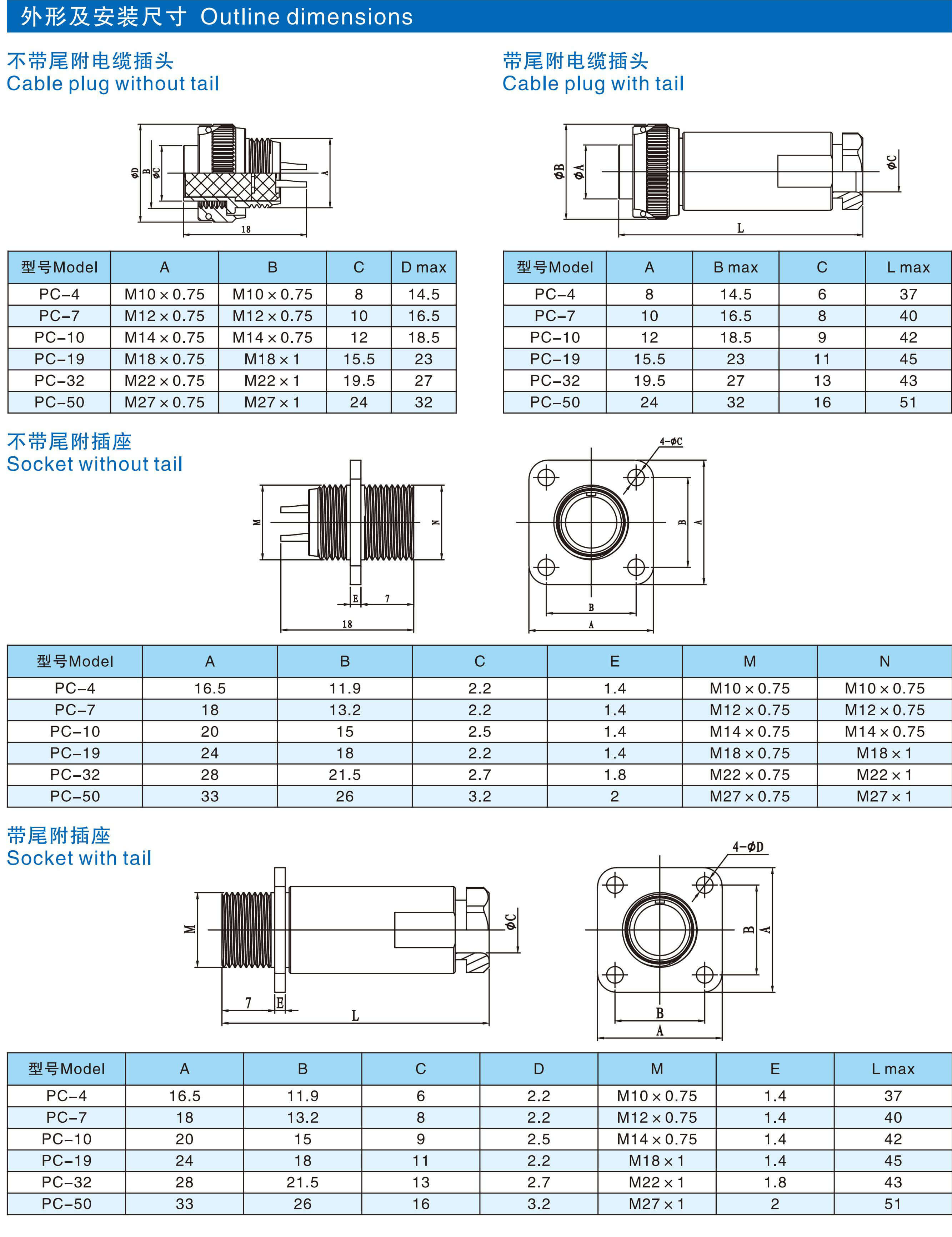 PC系列超小型圓形電連接器用于無線電和電器設(shè)備上的電路連接。通過帶有螺紋的連接螺母將電纜插頭與固定在裝置上的插座相連。兩裝置間也可通過裝在各裝置上的插頭插座直接實現(xiàn)連接(對接)。超小型圓形電連接器有密封、非密封之分,插頭和插座可分別帶有尾部附件。插座裝針,插頭裝孔。
