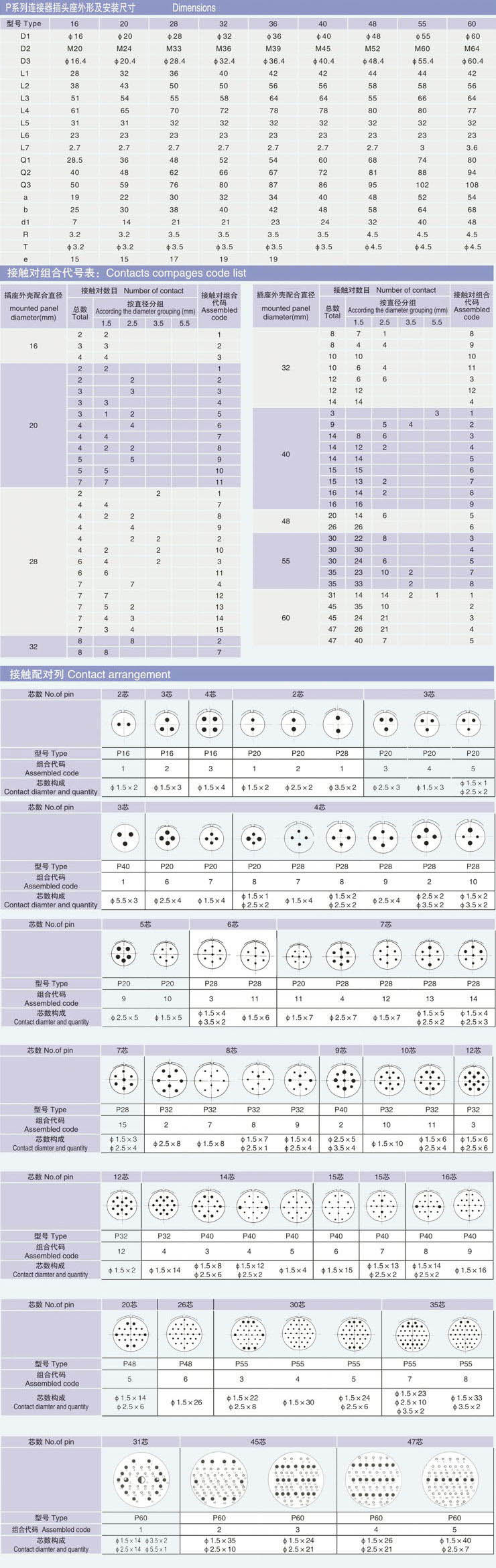 P系列普通圓形電連接器,符合SJ/T10496-94螺紋連接,1800多個規(guī)格,包括:直式、彎式、屏蔽式、非屏蔽式、密封、非密封等。接觸件直徑φ1.5、φ2.5、φ3.5、φ5.5mm,鍍金,銀。