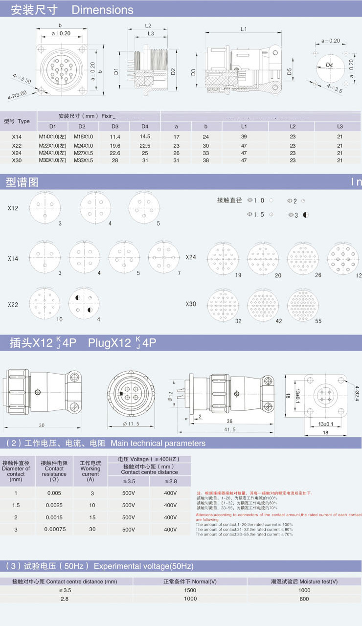 X系列小圓形插頭座適用于電氣及無線電備間,電纜與電纜間的連接,它代替CX型和ZCX型插頭座,若接觸對(duì)直徑、數(shù)目、及分布位置相同者,可互換??擅姘灏惭b,也可對(duì)接用。該型號(hào)產(chǎn)品符合電子工業(yè)標(biāo)準(zhǔn)SJ1743-81.