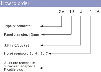 XS12 series push pull connector panel mounted size is 12mm.contact quantity are subdivided into 4 klnds of 3.4.5 and 7pins.the plug has two types.one is cable plug,the other is with rubber sleeve.the socket has two shapes.square and circular both of the印can be dlrectly mounted.the connector is compact and has a nice looking appeance.quick and easy for inserting and withdrawing.products are suitable for connectlon of bothA.c.and D.C.circulis of various instruments and electronic equipments.